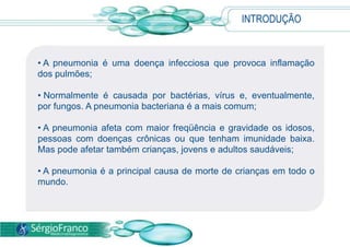 A pneumonia é uma doença infecciosa que causa inflamação nos pulmões, geralmente causada por bactérias, vírus ou fungos. Os sintomas incluem febre, tosse com catarro, dor no peito e dificuldade para respirar. O diagnóstico é feito com exames de imagem e análises e o tratamento varia de acordo com o agente causador, podendo incluir antibióticos, medicações ou oxigênio. A prevenção envolve hábitos saudáveis e vacinação.