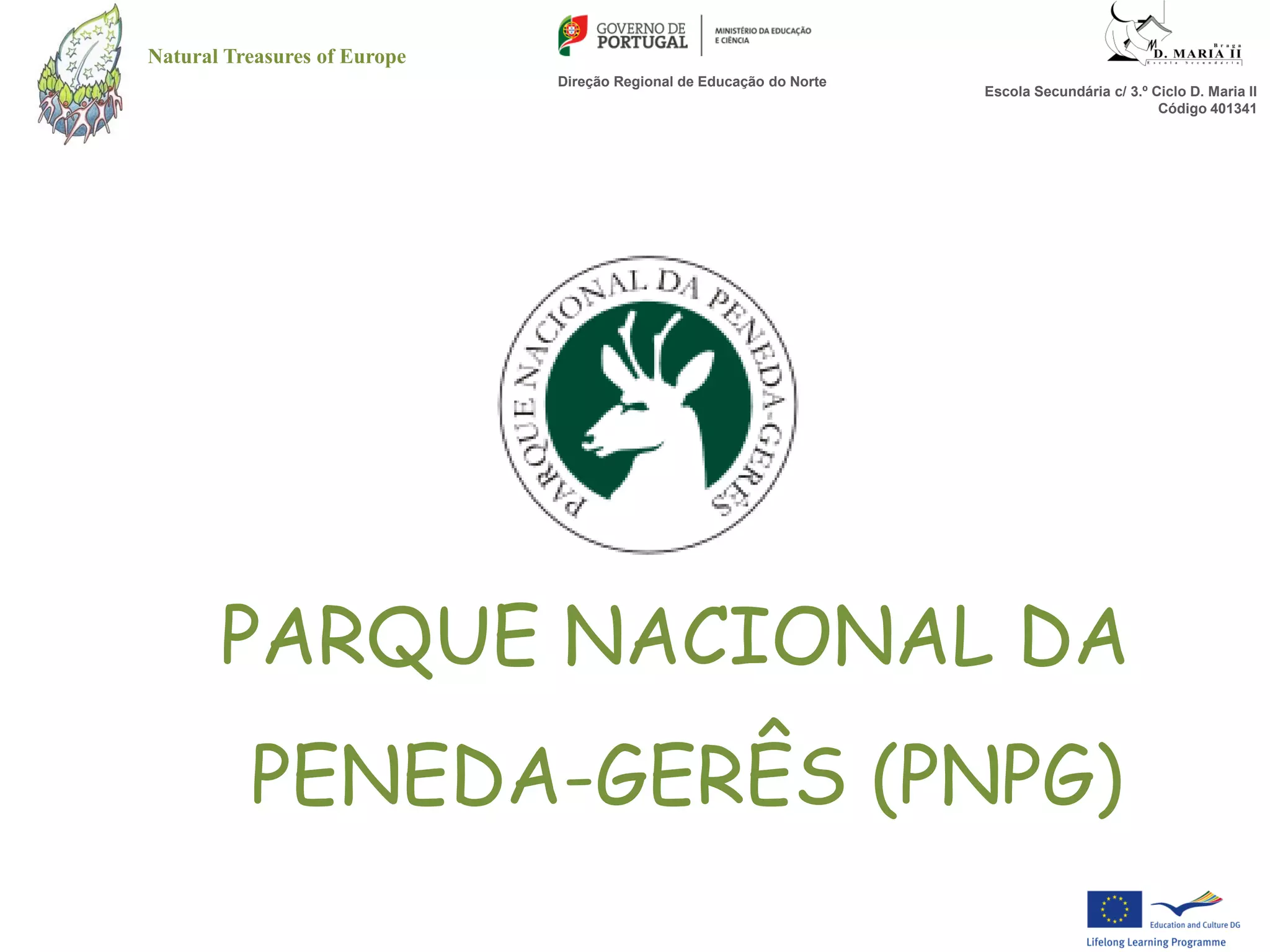 O documento resume as principais características naturais e históricas do Parque Nacional da Peneda-Gerês em Portugal, incluindo sua localização, geologia, flora e fauna diversas, fungos, ocupação humana histórica, e trilhos para caminhadas.