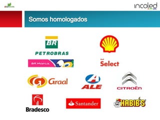 A Incoled é uma empresa que oferece produtos de iluminação LED para postos de combustíveis, lojas e outros ambientes comerciais. Suas luminárias modulares oferecem alta eficiência, durabilidade acima de 50.000 horas e economia de até 70% no consumo de energia em comparação a sistemas convencionais. A Incoled também fornece kits prontos para instalação de LED em testeiras de postos.