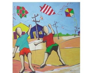 O documento descreve a vida e obra do artista plástico Ivan Cruz. Começou pintando cenas de sua infância em Cabo Frio, especialmente brincadeiras de crianças. Sua série "Brincadeiras de Criança" retrata mais de 100 brincadeiras e se tornou um projeto com oficinas e contos para preservar esse patrimônio cultural. Sua motivação é fazer com que todos retomem a alegria de brincar na infância.