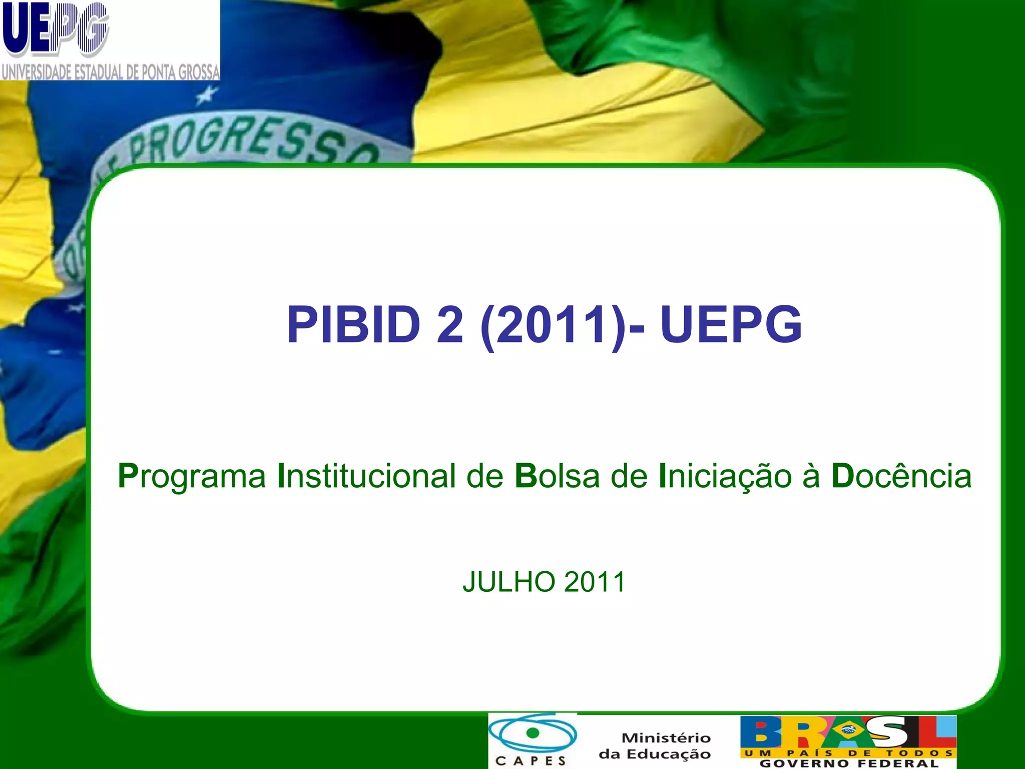 O documento descreve o Programa Institucional de Bolsa de Iniciação à Docência (PIBID) da Universidade Estadual de Ponta Grossa (UEPG). O PIBID tem como objetivos valorizar a docência, melhorar a qualidade da educação básica e promover a integração entre a educação superior e básica. O projeto da UEPG envolve 10 subprojetos e 104 bolsistas que atuarão em 13 escolas públicas.