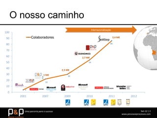 Este documento apresenta uma empresa de consultoria e serviços de TI chamada P&P. Apresenta sua missão, visão e valores, histórico de crescimento, serviços oferecidos como consultoria, gestão de projetos, implementação e formação. Também descreve suas subsidiárias Giganomics e SkillStep e alguns de seus principais clientes.