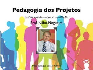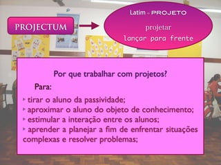 O documento apresenta as etapas da pedagogia dos projetos: 1) planejamento com definição de objetivos, 2) execução, 3) depuração para melhoria, 4) apresentação para consolidação do conhecimento, 5) autoavaliação e crítica construtiva, 6) avaliação do professor sobre o alcance dos objetivos. A pedagogia dos projetos busca tirar o aluno da passividade e aproximá-lo do conhecimento de forma colaborativa.