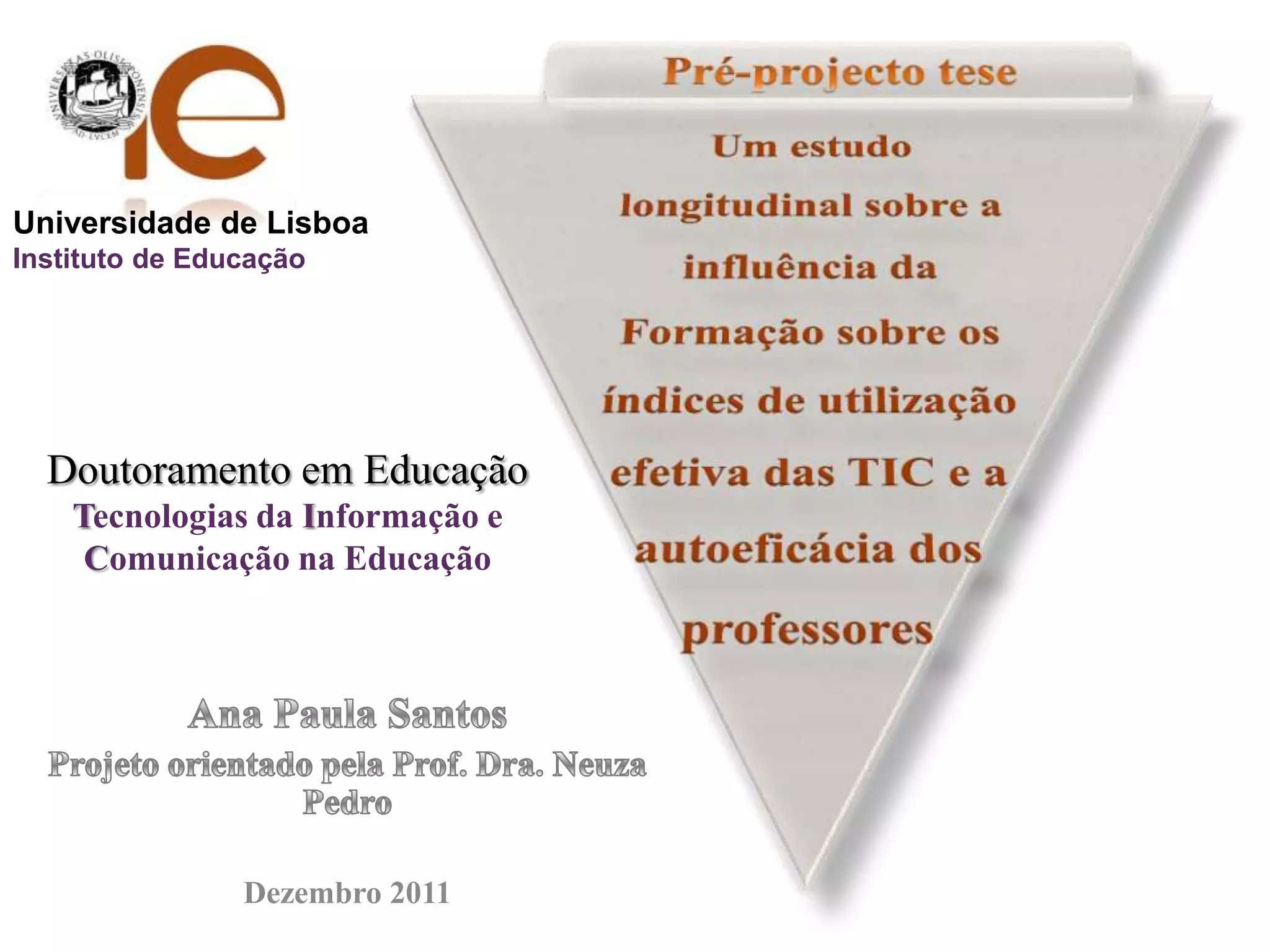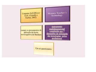 Este documento descreve uma pesquisa de doutorado sobre como a formação em tecnologias da informação e comunicação influencia a autoeficácia e o uso das TIC por professores ao longo do tempo. A pesquisa irá aplicar questionários e entrevistas com 130 professores de 6 turmas em vários momentos para analisar como a utilização das TIC é afetada a curto, médio e longo prazo pela formação. Os resultados esperados são verificar se a formação alterou as práticas docentes de forma sustentada e identificar como manter os efe