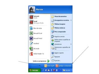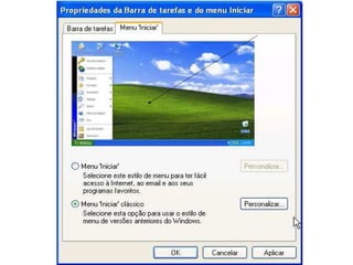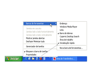 O documento descreve os principais elementos de um sistema operacional Windows, incluindo ícones, atalhos, diretórios e subdiretórios equivalentes a pastas e subpastas.