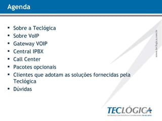 O documento aborda soluções de telefonia digital oferecidas pela Teclógica, destacando a tecnologia VoIP, gateways, centrais IPBX e call centers. São apresentadas características e benefícios, como redução de custos em ligações e integração de filiais, além de pacotes opcionais como Ura e salas de teleconferência. O material é destinado a empresas que buscam otimizar suas comunicações e reduzir despesas operacionais.