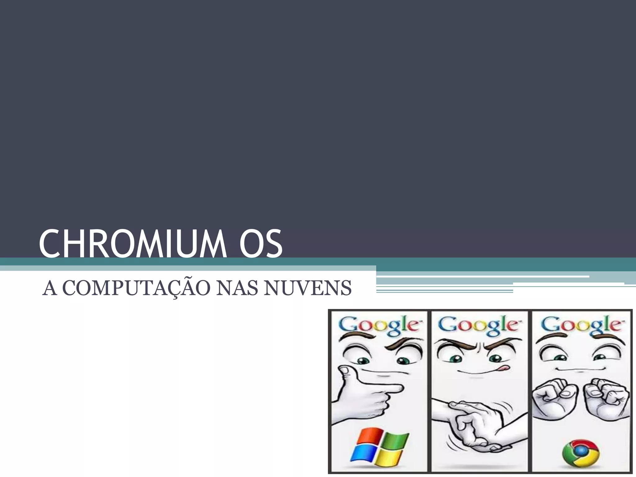 O documento discute o sistema operacional Chrome OS do Google, que roda aplicativos na nuvem. O Chrome OS é baseado no navegador Chrome e visa mudar o conceito de sistemas operacionais, tornando o navegador o centro do computador. Questões como segurança, privacidade e confiabilidade do armazenamento na nuvem são discutidas.
