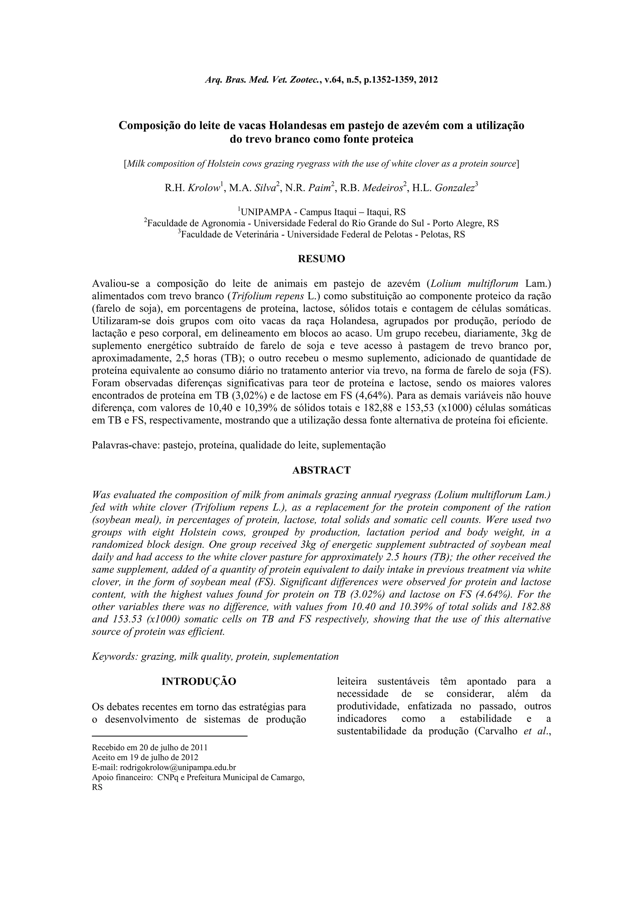 O documento avalia a composição do leite de vacas Holandesas em pastejo de azevém com ou sem o uso de trevo branco como fonte proteica. Foi observado que o leite de vacas que tiveram acesso ao trevo branco teve maior teor de proteína (3,02%), enquanto o leite das vacas que receberam farelo de soja teve maior teor de lactose (4,64%). Não houve diferença entre os grupos nos teores de sólidos totais e contagem de células somáticas no leite