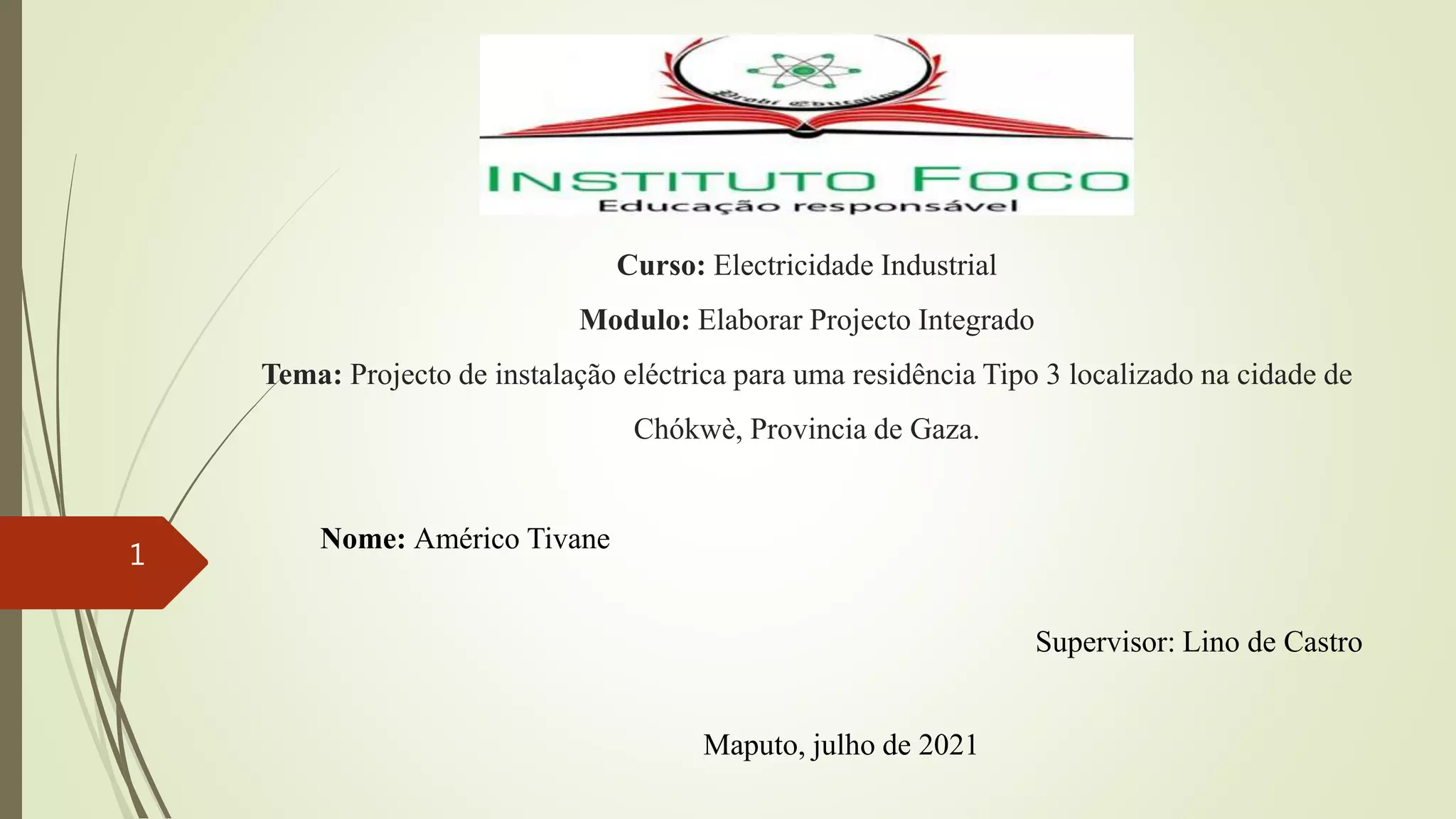 Este projeto apresenta o dimensionamento e especificações técnicas para a instalação elétrica de uma residência Tipo 3 localizada em Chókwè, Gaza, incluindo cálculos de potência, seleção de cabos e disjuntores, e detalhes sobre quadros elétricos, circuitos e sistema de proteção.