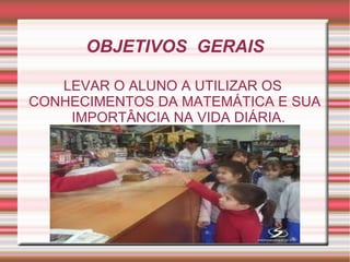 Este projeto visa desenvolver o interesse dos alunos sobre o sistema monetário através de pesquisas de preços, montagem de mini-mercados, jogos de computador sobre números e dinheiro, com o objetivo de levar os alunos a utilizar conhecimentos de matemática na vida diária e motivar o uso adequado do dinheiro na sociedade.