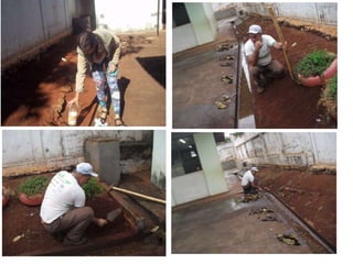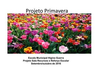 Este documento descreve um projeto realizado na Escola Municipal Higino Guerra em setembro/outubro de 2016 chamado "Primavera". O projeto envolveu a criação de um jardim na escola e atividades relacionadas à jardinagem e meio ambiente com os alunos. O documento fornece detalhes sobre como cuidar da planta Onze Horas e fotos do antes e depois do jardim criado.