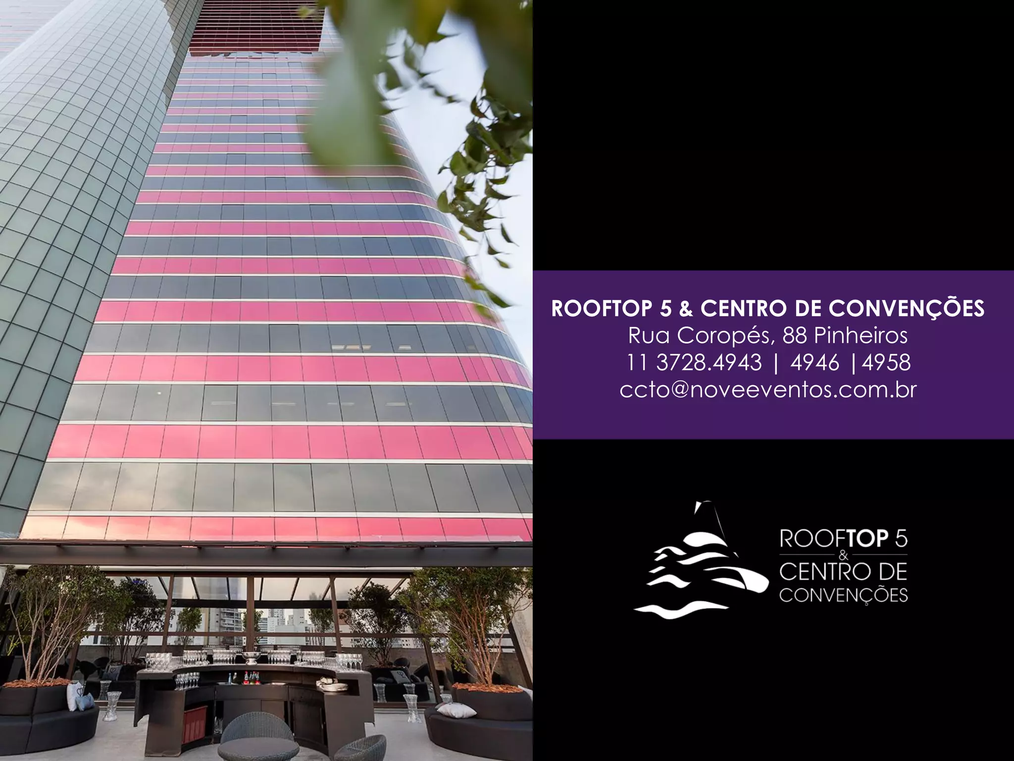 O Rooftop 5 & Centro de Convenções, localizado na Rua Coropés, 88, em Pinheiros, é um espaço que já recebeu 150 eventos e mais de 25.000 participantes, oferecendo uma vista quase panorâmica da cidade. O local conta com cinco andares, diversos ambientes versáteis e uma infraestrutura completa, além de receber elogios pela qualidade de atendimento e serviços. Os organizadores destacam a excelente localização e o espaço amplo como fatores decisivos para realizar eventos no local.