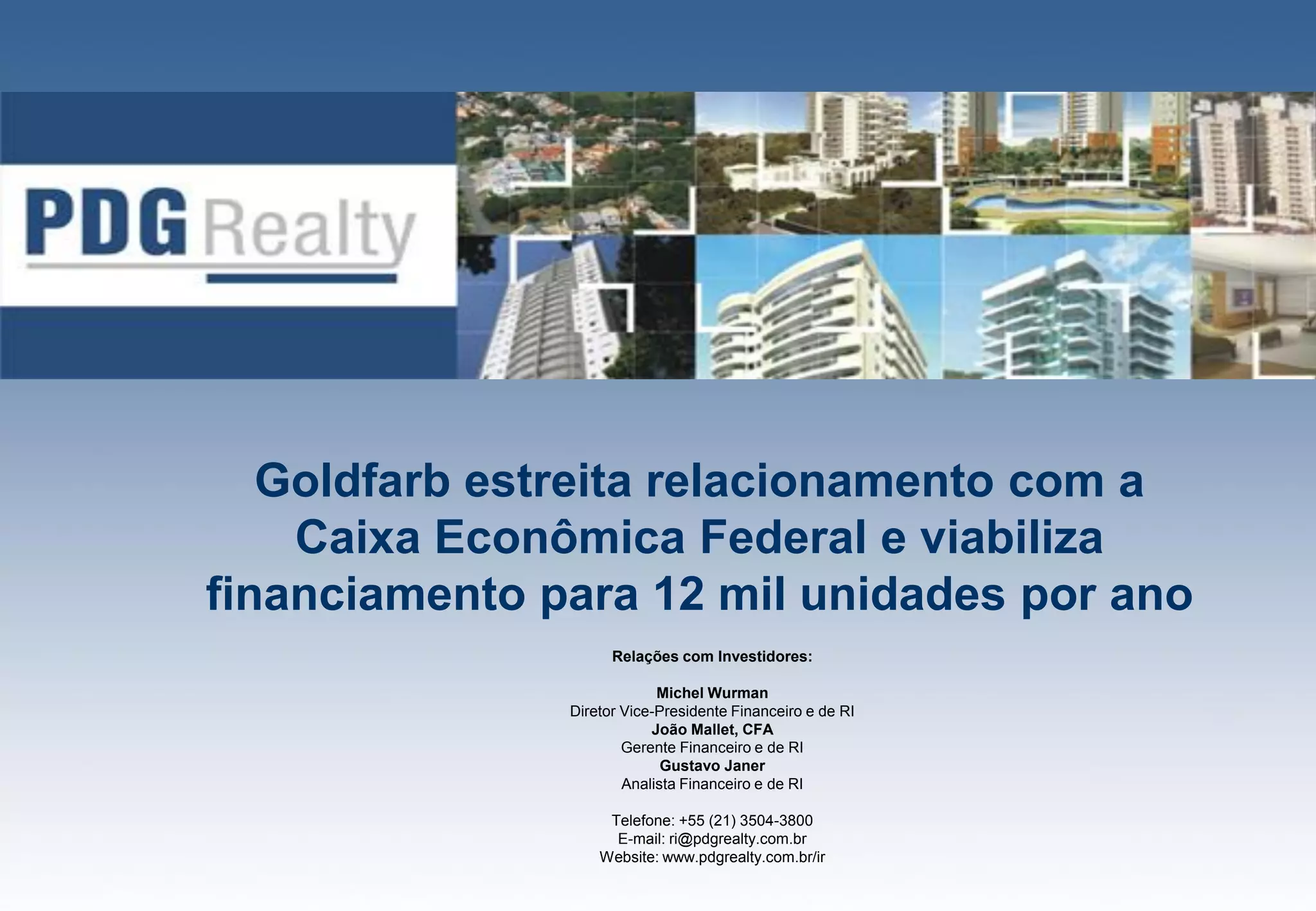 A PDG Realty estreitou sua relação com a Caixa Econômica Federal e viabilizou um financiamento de até R$1,2 bilhões por ano para 12 mil unidades habitacionais. A parceria cria um fluxo de aprovação de crédito dedicado exclusivamente aos clientes da PDG e consolida a empresa como a maior operadora de crédito associativo da CEF.