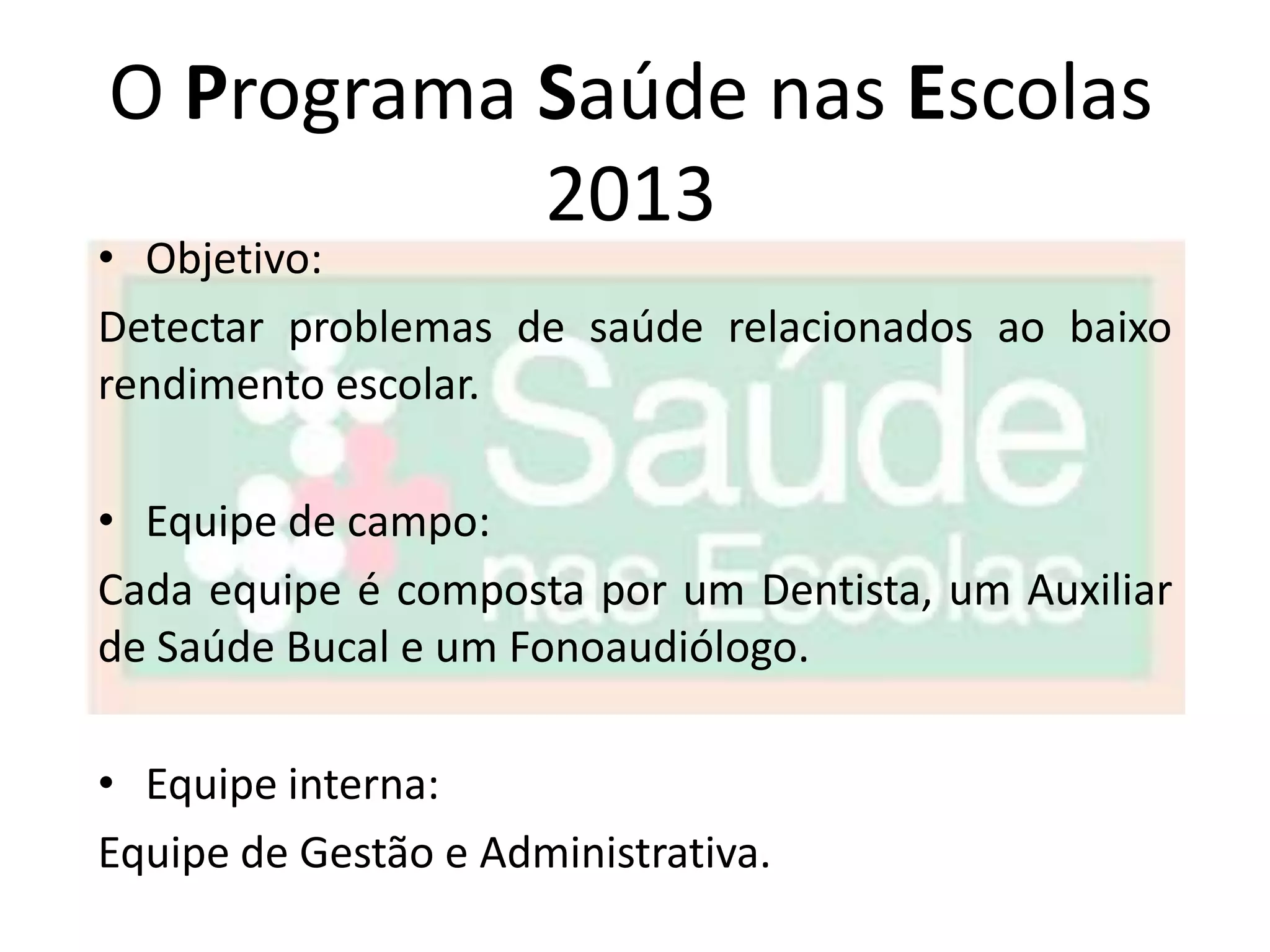 O documento descreve o planejamento do Programa Saúde nas Escolas de 2013 na cidade do Rio de Janeiro, com equipes de saúde visitando escolas para detectar problemas de saúde em alunos e fazer exames bucais, auditivos e visuais. As escolas serão atendidas em ordem decrescente por CRE no período de fevereiro a maio, e os resultados dos exames serão enviados para a rede de saúde para encaminhamento.