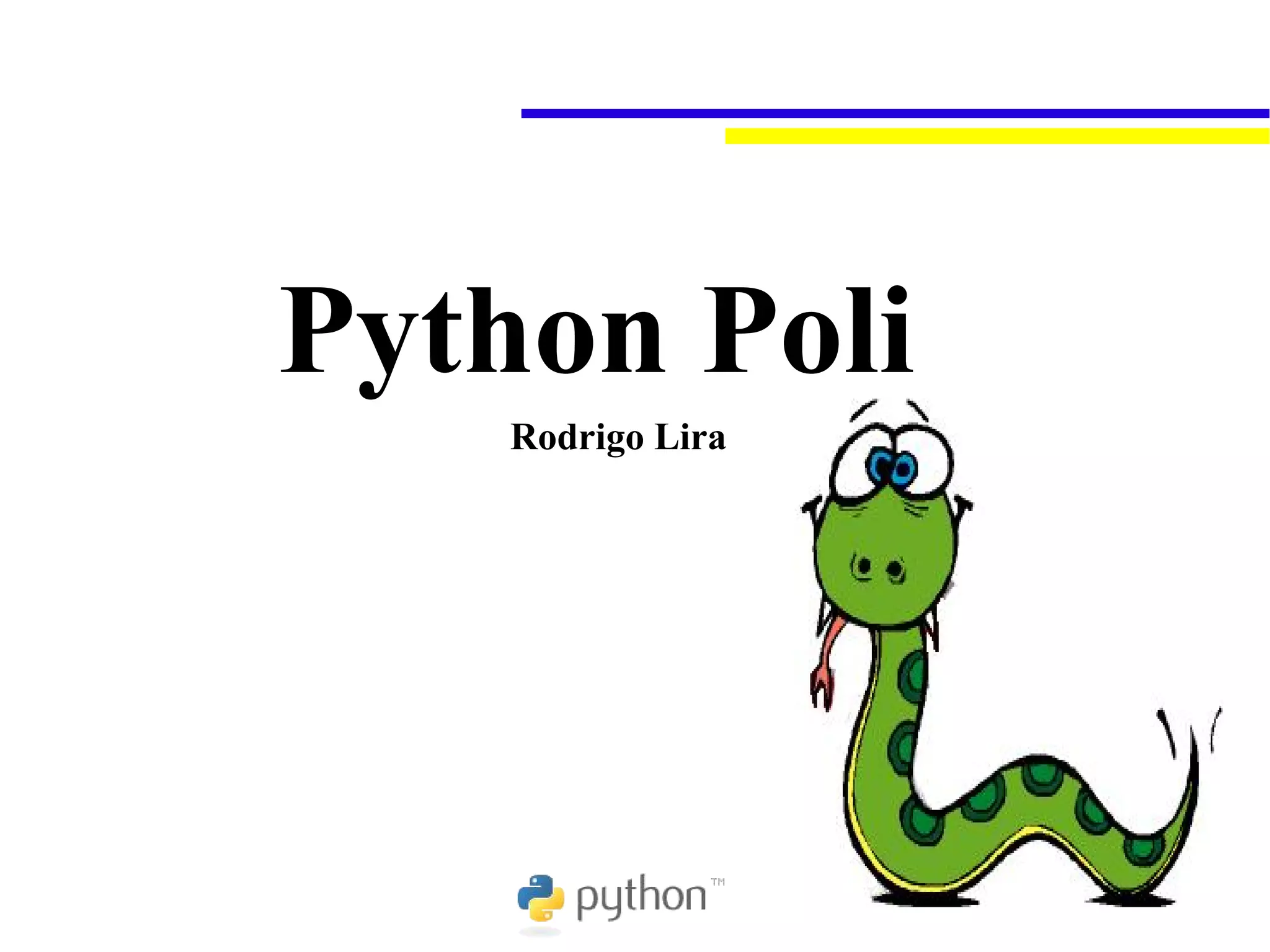 Python é uma linguagem de programação de alto nível, criada por Guido van Rossum em 1989, conhecida por sua sintaxe simples e versatilidade. É amplamente utilizada em empresas como Google e Yahoo!, sendo fundamental para suas operações. O Python Poli é um grupo de estudos criado em 2004 dedicado ao aprendizado e aplicação da linguagem Python na resolução de problemas computacionais.