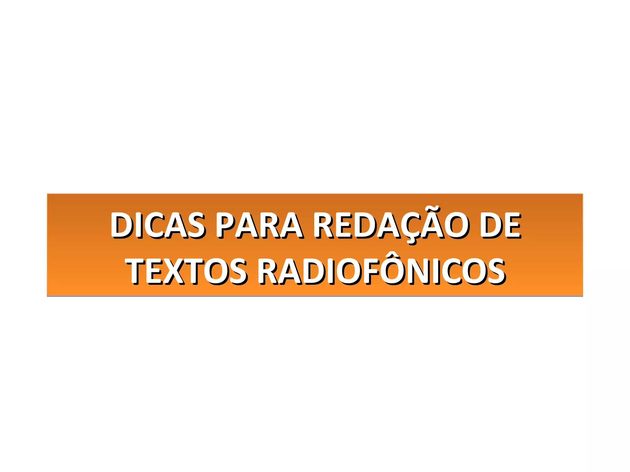 Este documento fornece dicas para redação de textos radiofônicos, enfatizando a importância de frases curtas e diretas, evitar repetições, usar números e datas de forma clara, e pontuação adequada para facilitar a leitura em voz alta.
