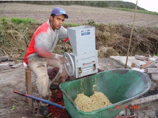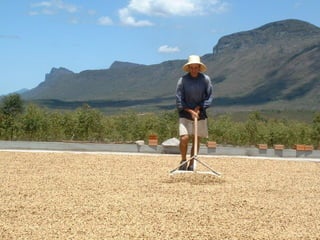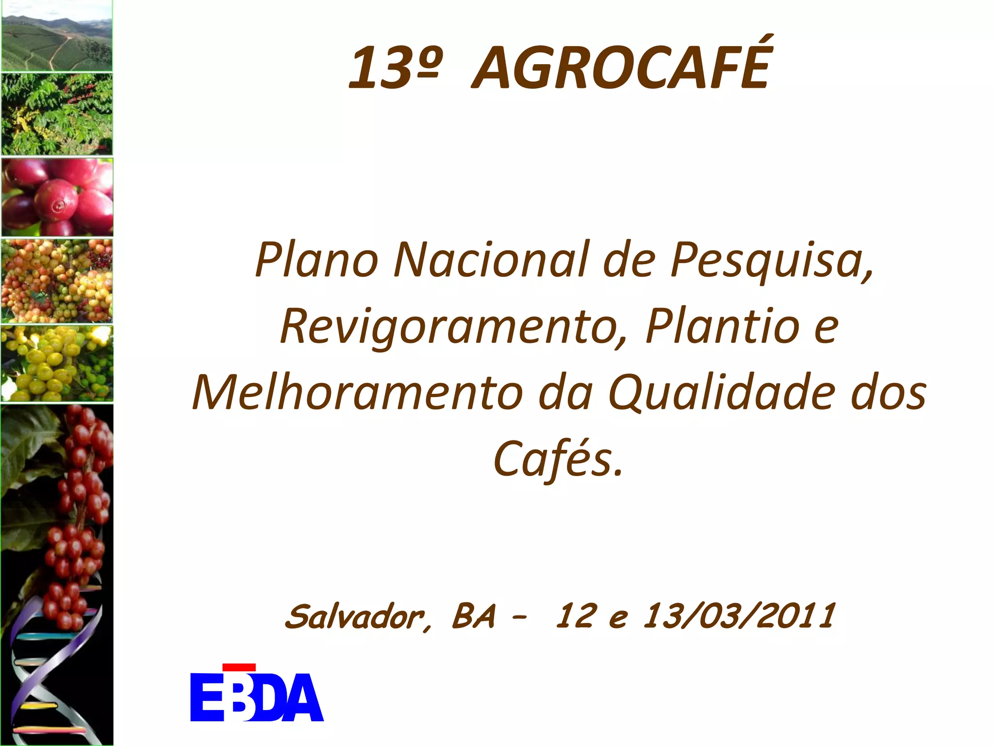 O documento resume a situação da cafeicultura na Bahia, destacando as principais regiões produtoras, os desafios atuais e as ações propostas. As três principais regiões são o Pólo Atlântico, o Pólo Cerrrado e o Pólo Planalto. O plano nacional proposto visa revigorar e renovar lavouras nessas regiões ao longo de cinco anos com investimentos de R$450 milhões.