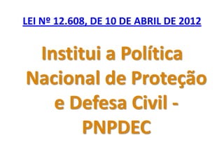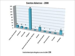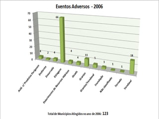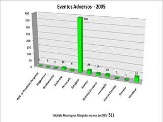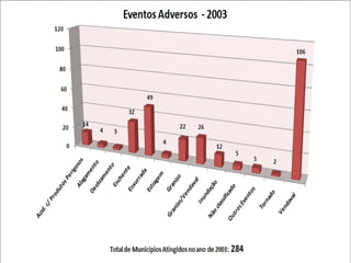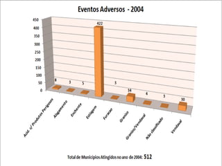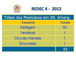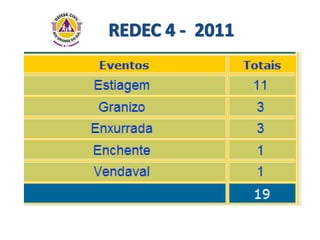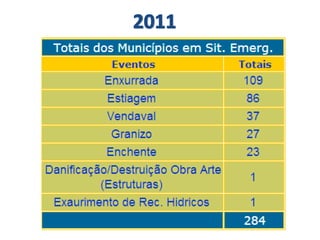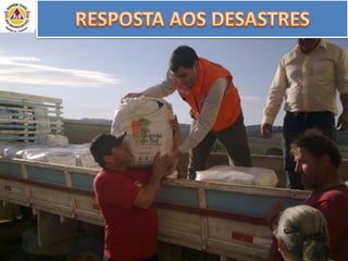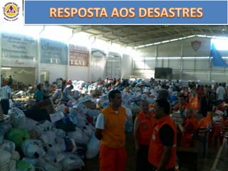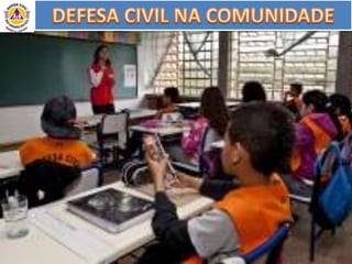 Este documento descreve as responsabilidades e atividades da Defesa Civil do estado do Rio Grande do Sul no Brasil. A Defesa Civil é responsável por (1) executar a Política Nacional de Proteção e Defesa Civil em seu território, (2) coordenar as ações do Sistema Nacional de Proteção e Defesa Civil, e (3) declarar estado de calamidade pública ou situação de emergência quando necessário. A Defesa Civil trabalha para reduzir desastres por meio de preparação, prevenção, resposta e reconstrução.