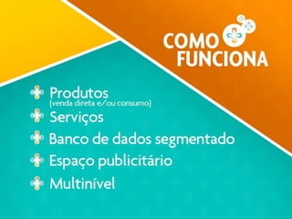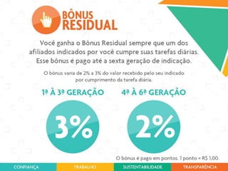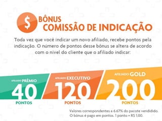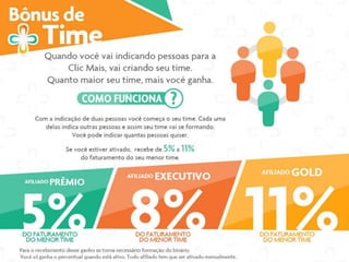 Este documento descreve os benefícios e plano de carreira da empresa Linha Impact Ge. Os associados podem ganhar bônus através de vendas diretas, bônus residuais, bônus de equipe, e atingindo diferentes níveis da carreira que incluem Rubi, Safira, Esmeralda e Diamante. Os associados de nível mais alto como Turmalina podem ganhar prêmios valiosos como carros esportivos.
