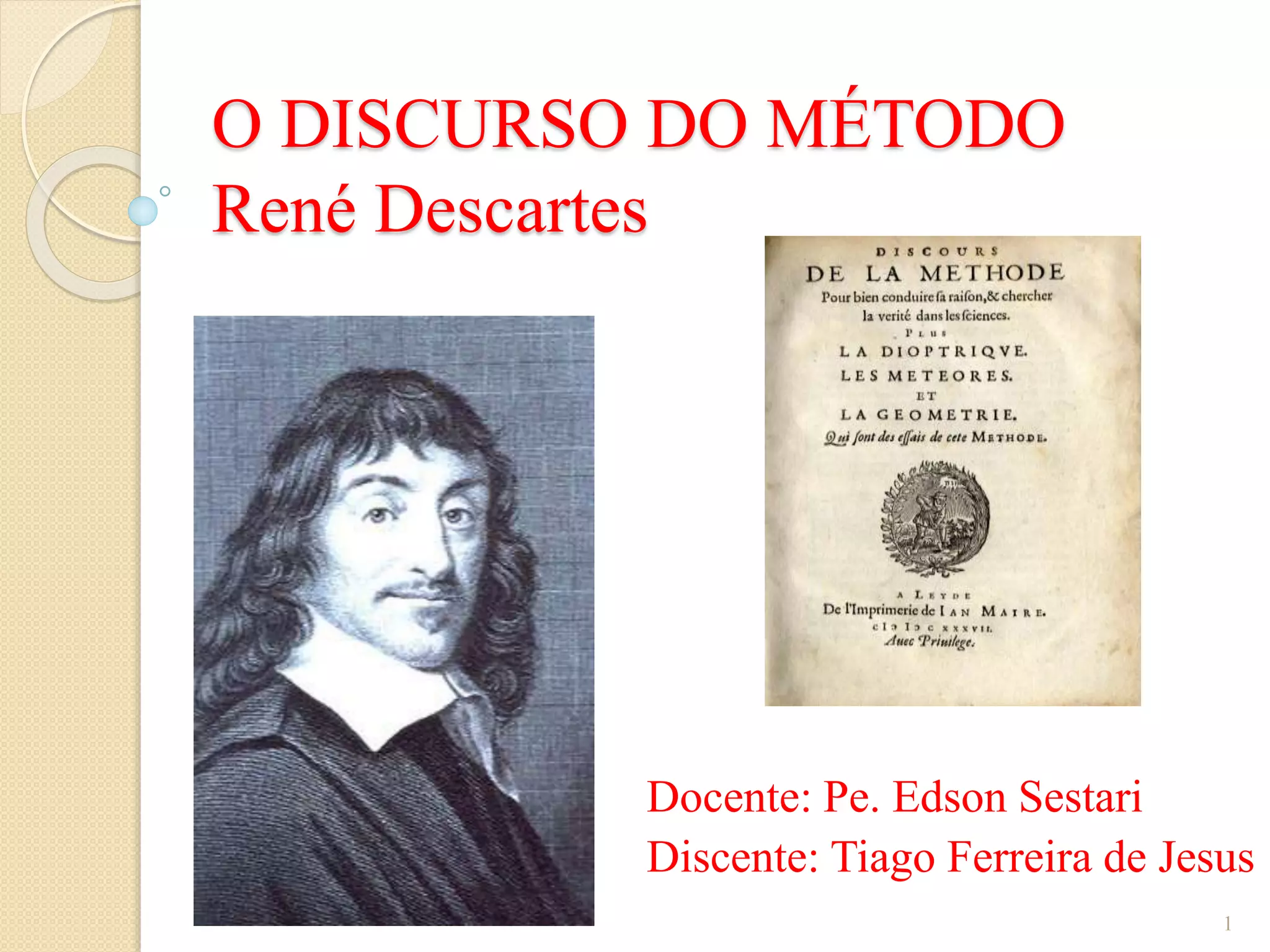 O documento resume a vida e o trabalho filosófico de René Descartes, com destaque para sua principal obra "Discurso do Método". O texto descreve a biografia de Descartes, suas principais ideias e as partes que compõem o "Discurso do Método", incluindo a dúvida metódica, a existência de Deus e a distinção entre matéria e mente.