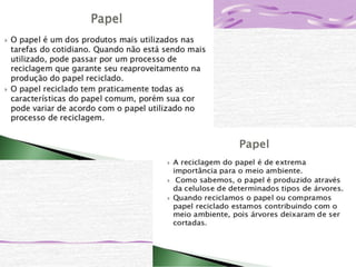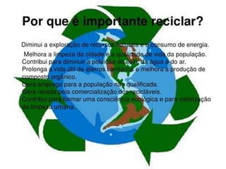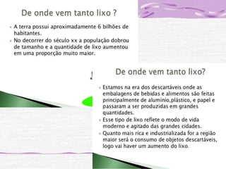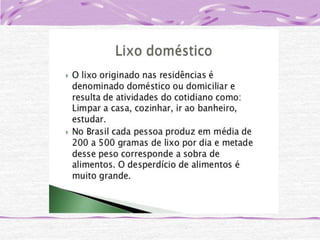 O documento discute a política nacional de resíduos sólidos no Brasil, incluindo as leis e regulamentações relevantes. Atualmente, 50,4% dos resíduos são descartados em lixões a céu aberto, colocando a saúde pública em risco. A legislação busca acabar com os lixões até 2014 e substituí-los por aterros sanitários, além de incentivar a logística reversa e reciclagem para reduzir o volume de resíduos e gerar renda para catadores.