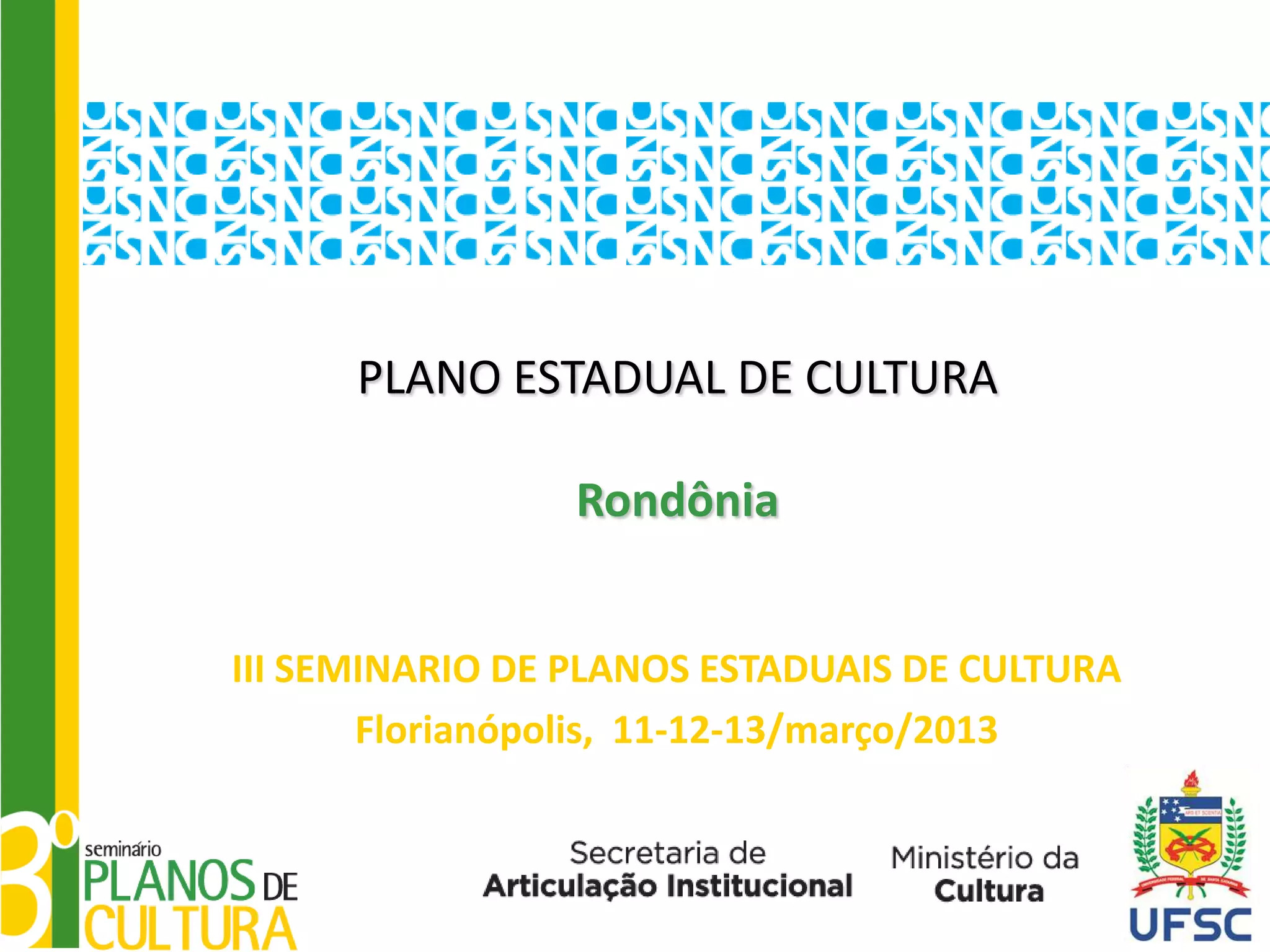 O documento apresenta o plano estadual de cultura de Rondônia, descrevendo a equipe responsável, as instâncias de participação durante o processo de elaboração do plano, resumindo quantitativamente as diretrizes, desafios, oportunidades, objetivos, estratégias e ações propostas, além de detalhar três estratégias com suas respectivas ações e metas.