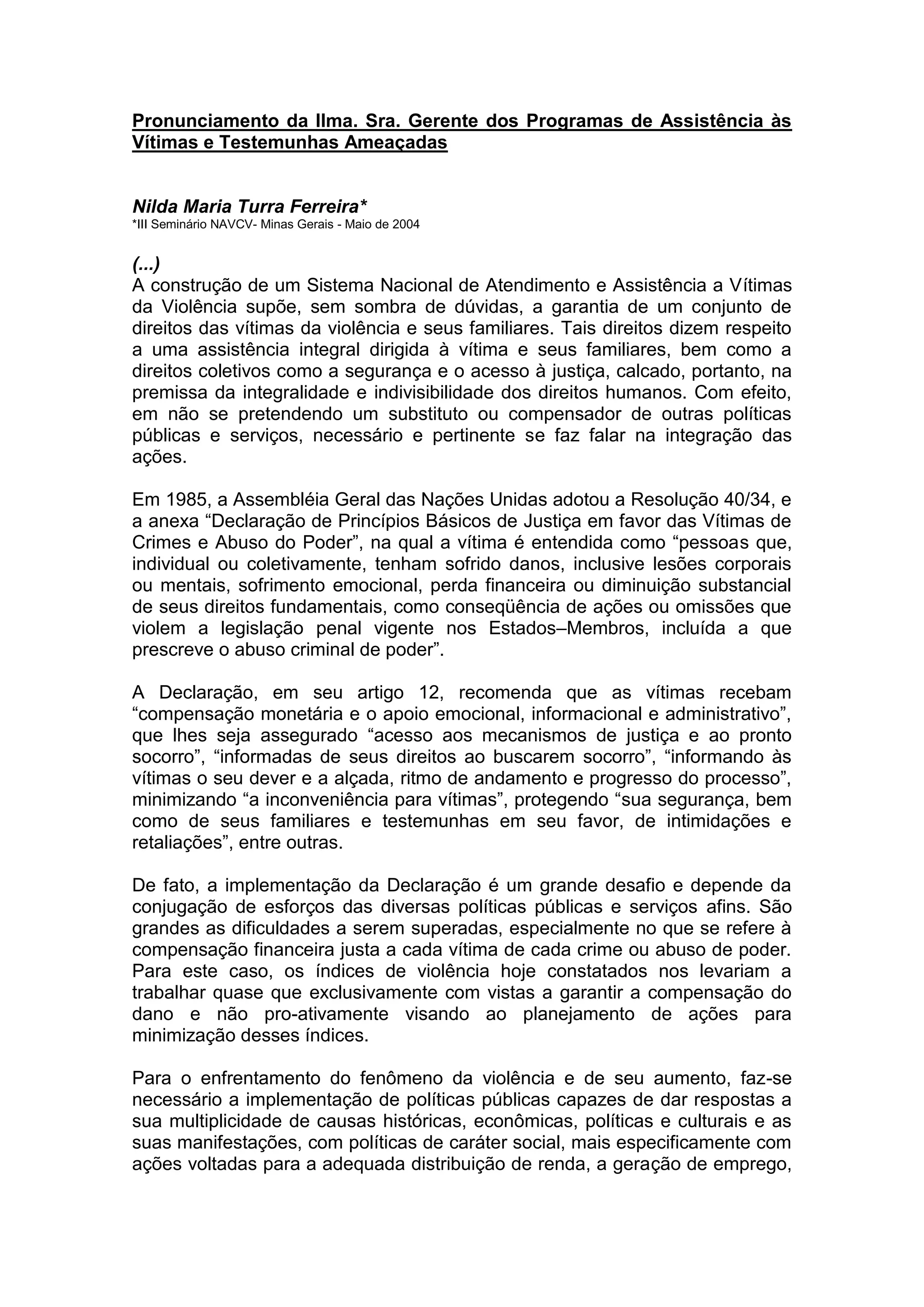 O documento discute a implementação de centros de assistência e apoio a vítimas de crimes no Brasil pelo Ministério da Justiça desde 1999. Esses centros fornecem assistência jurídica, psicológica e social às vítimas e familiares, promovendo o acesso à justiça e os direitos humanos. Atualmente, existem centros implementados em vários estados brasileiros.