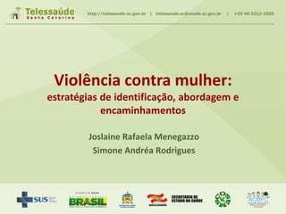 O documento discute estratégias para identificar, abordar e encaminhar casos de violência contra a mulher. Apresenta definições de violência e violência contra a mulher, fatores de risco e proteção, condutas profissionais para atendimento, indicadores de violência, plano de segurança para vítimas e protocolos de notificação e atendimento.