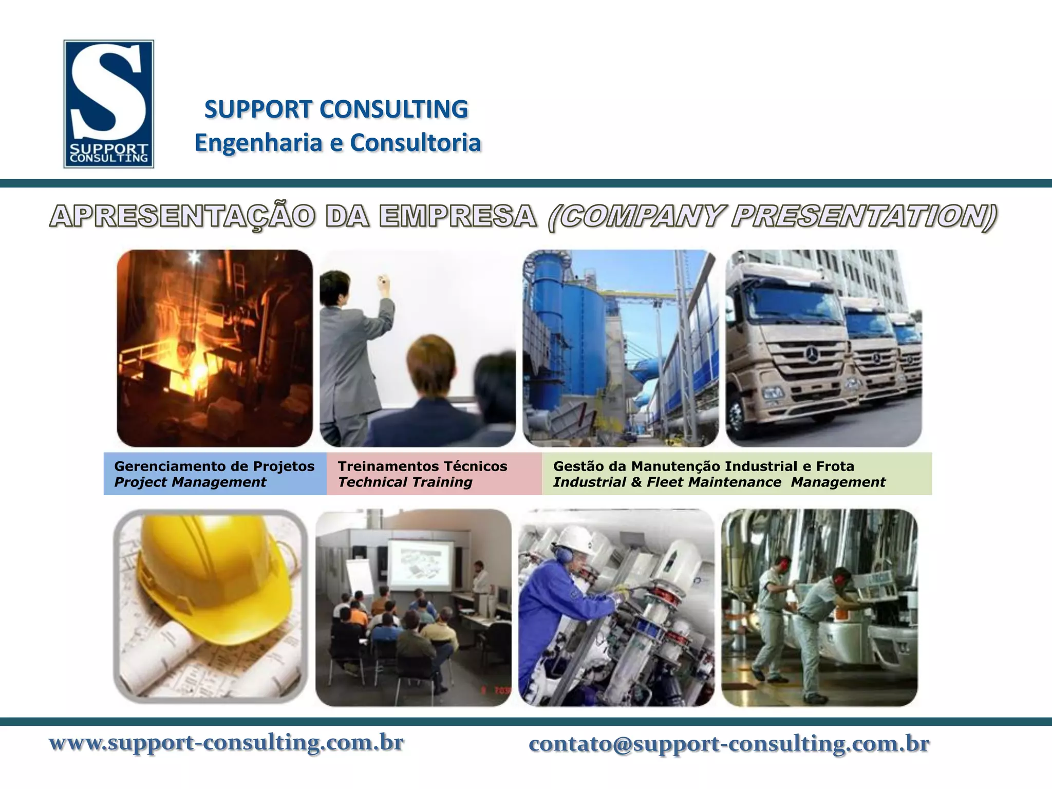 A Support Consulting é uma empresa de engenharia e consultoria com sede em São Paulo que oferece serviços de gerenciamento de projetos, treinamentos técnicos, consultoria em manutenção industrial e gestão de frota. A empresa tem experiência em diversos setores como siderurgia, mineração, óleo e gás, entre outros.