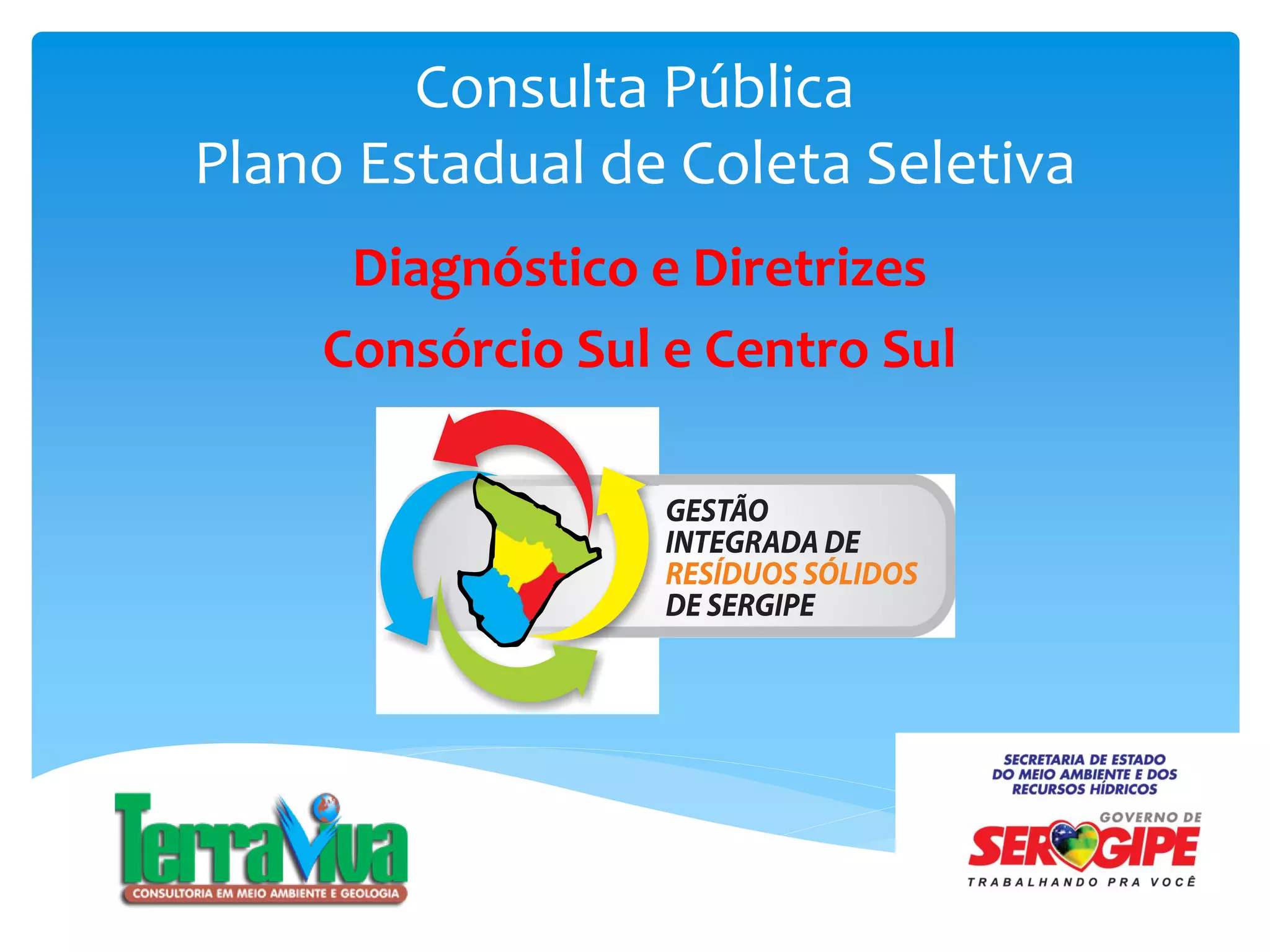 O documento apresenta o diagnóstico e diretrizes do Plano Estadual de Coleta Seletiva para 16 municípios do Consórcio Sul e Centro Sul de Sergipe. O diagnóstico inclui: perfil dos catadores que atuam nos lixões, comercialização de recicláveis e situação da coleta seletiva em cada município. As diretrizes incluem medidas de orientação para implantação da coleta seletiva considerando as dificuldades encontradas.