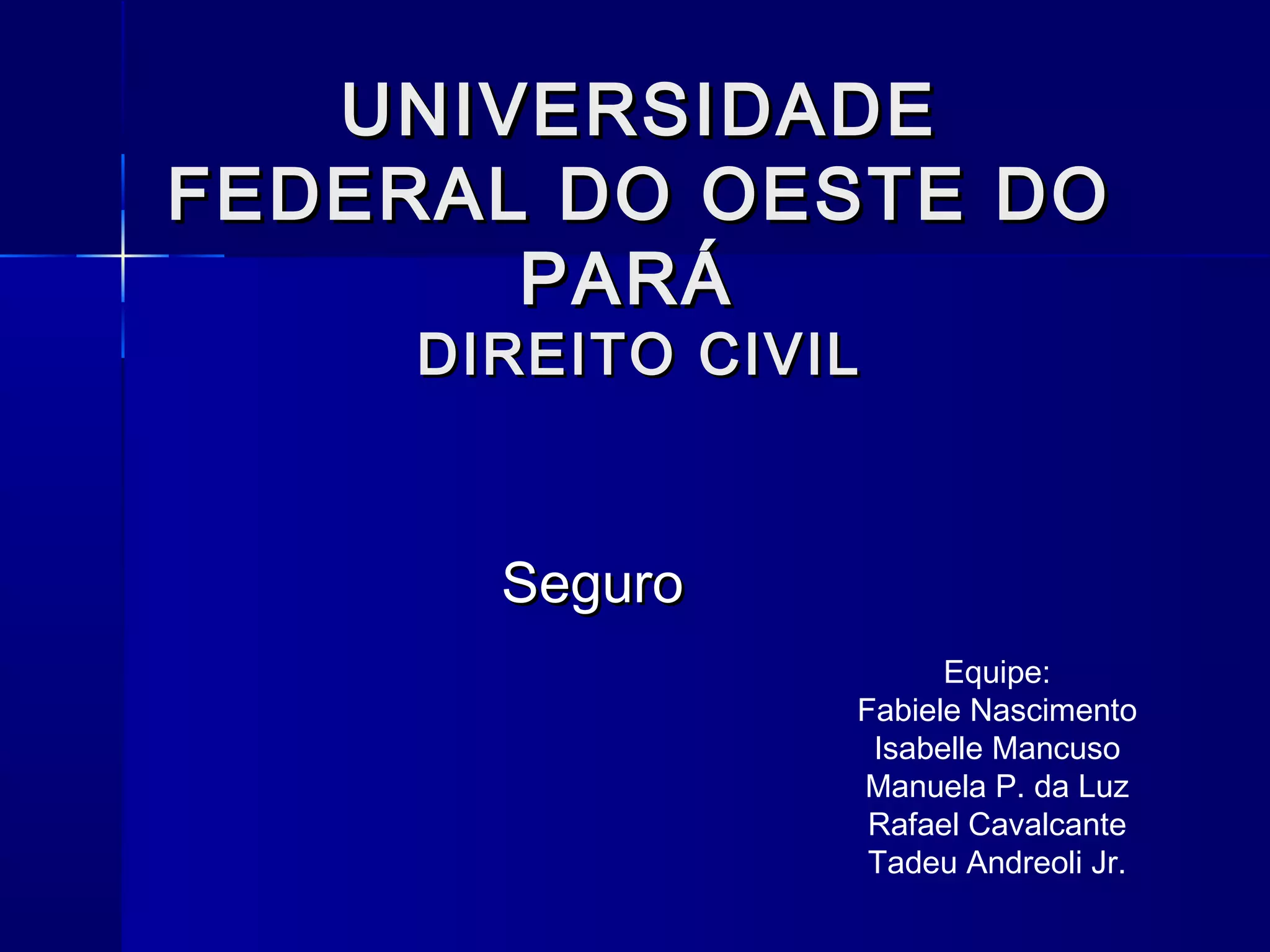 O documento discute o tema de Seguro no Direito Civil. Apresenta os tipos de seguro de pessoa, como seguro de acidentes pessoais e seguro de vida. Também aborda conceitos jurídicos como sistema, norma, princípio e regra no contexto do seguro.