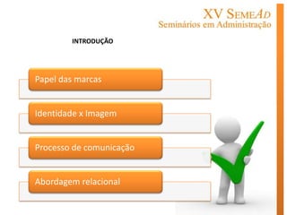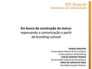 Este documento discute como a marca Jack Búfalo pode ser construída como uma marca identitária para motociclistas através do branding cultural. Ele revisa conceitos de identidade versus imagem de marca e processos de comunicação, e propõe pesquisa qualitativa exploratória com entrevistas semiestruturadas de motociclistas para entender como desenvolver a marca culturalmente.