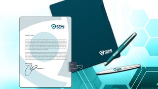 O documento apresenta o processo de desenvolvimento de uma identidade visual para a marca SEMI, incluindo pesquisa, desenvolvimento de conceitos, design do logotipo, e aplicações do logotipo. Explica os significados por trás do logotipo e como ele representa valores de força e segurança. Também discute a importância de criar uma marca distinta e reconhecível.