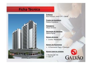 O empreendimento residencial Set Cabral conta com 2 torres e 144 unidades residenciais e 7 unidades comerciais distribuídas em 15 pavimentos. As unidades residenciais variam entre 2 e 3 quartos com áreas entre 64m2 e 164m2 e contam com 1 ou 2 vagas de garagem. O condomínio oferece diversas áreas comuns como piscina, academia, salão de festas e playground.