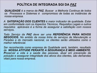 1) A empresa apresenta sua estrutura organizacional, valores, visão, missão e política integrada de qualidade, meio ambiente e saúde e segurança ocupacional.