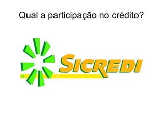 O documento analisa a participação do Sicredi no mercado de crédito e os argumentos usados para atrair clientes. O Sicredi é uma cooperativa financeira com mais de 2 milhões de associados que investem no crescimento mútuo. No entanto, há riscos em ser associado, como ter que aportar recursos caso haja prejuízo ou receber serviços de pouca qualidade. Além disso, as cooperativas não são totalmente transparentes sobre taxas e têm menos obrigações que bancos.