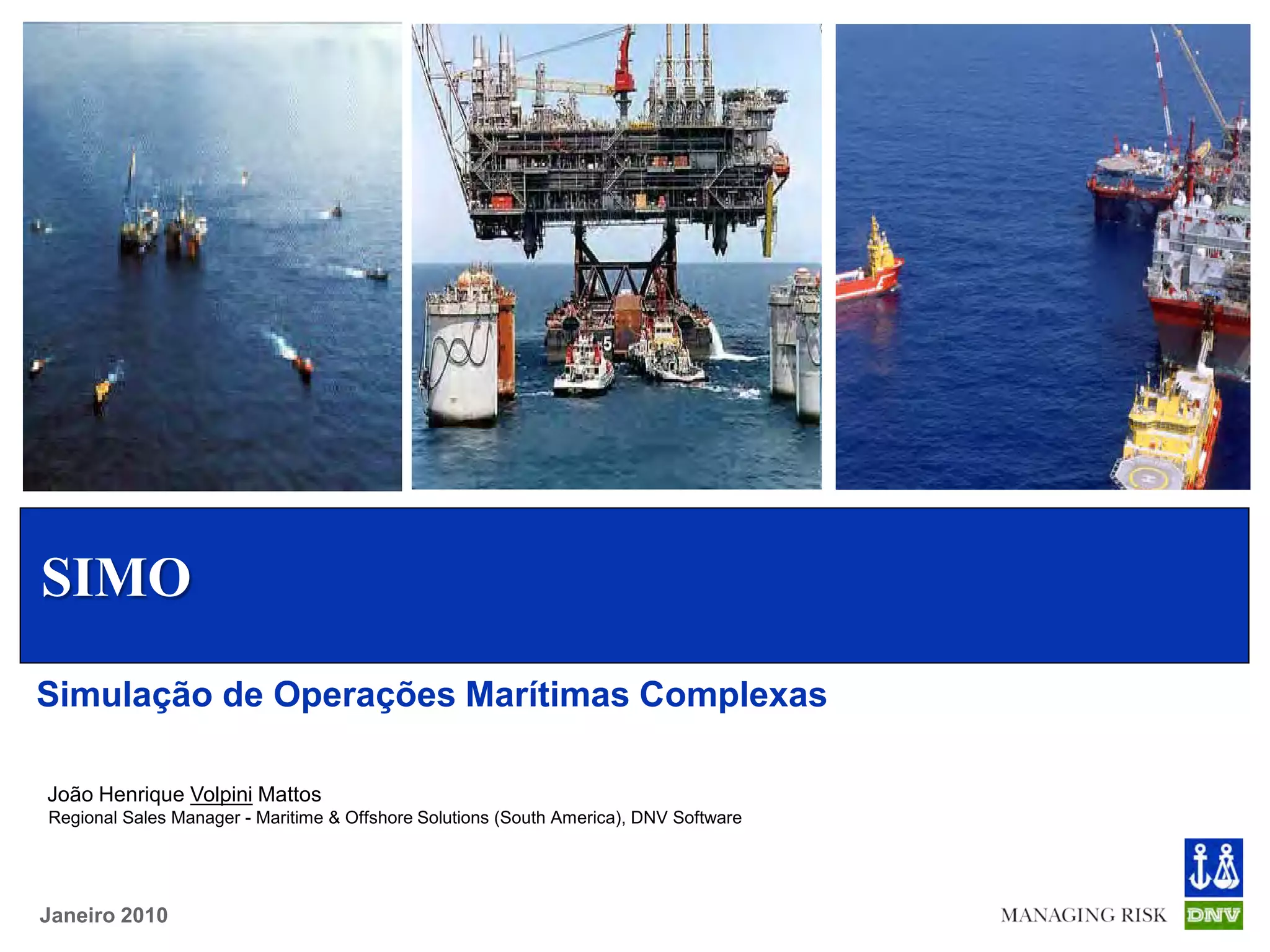 O documento apresenta o software SIMO, desenvolvido pela MARINTEK para simulação de operações marítimas. O SIMO permite modelagem flexível de sistemas multi-corpos e simulação do movimento considerando forças ambientais e de posicionamento. Fornece ferramentas para análise de segurança e desempenho de operações offshore complexas.