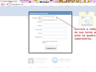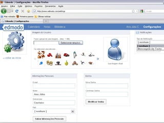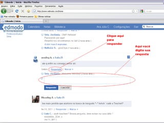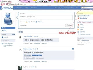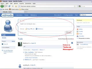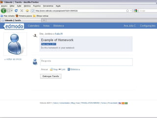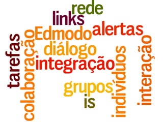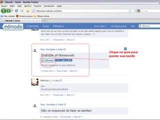 O documento descreve o Edmodo, uma plataforma online para comunicação entre professores e alunos de forma semelhante ao Facebook. Ele permite compartilhar textos, arquivos e ideias para gerar discussões sobre trabalhos de casa e projetos. Alunos podem publicar mensagens, responder a outras mensagens e entregar tarefas através da plataforma.