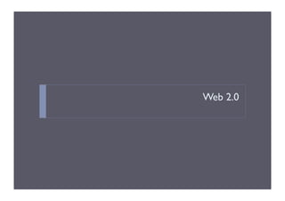 Este documento discute Web 2.0 e Software como Serviço (SaaS). Discute aplicações Web 2.0, a evolução da Web 2.0, a diferença entre Web 1.0 e Web 2.0, e o desenvolvimento de software como serviço. Também aborda tópicos como web services, a história e componentes básicos de web services.