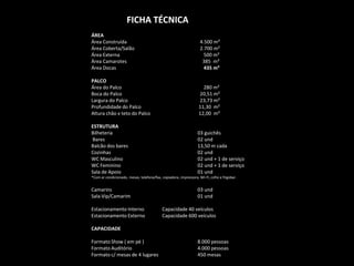O documento fornece informações técnicas sobre as instalações de um centro de eventos, incluindo sua área construída total de 4.500 m2, capacidade para receber entre 4.000 a 8.000 pessoas dependendo da configuração, e detalhes sobre o palco, estrutura, camarins e estacionamento.