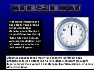 O documento discute como identificar e superar crenças limitadoras que impedem o alcance dos desejos. Sugere dar atenção diária aos desejos, identificando pensamentos repetitivos com palavras como "talvez" ou "quem sabe" que transmitem limitações. Também enfatiza a necessidade de colocar os desejos em prática ao invés de apenas pensar neles, acreditando na soberania de Deus.