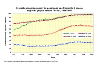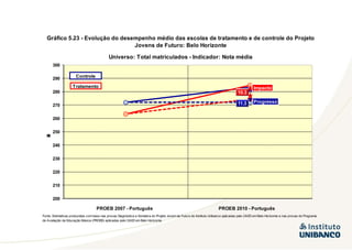 O documento resume os principais dados e desafios da educação brasileira, como a falta de professores e a baixa qualidade do ensino médio público. Apresenta o Projeto Jovem de Futuro, uma iniciativa do Instituto Unibanco para melhorar os resultados escolares por meio de autonomia, avaliação e reconhecimento. Os resultados iniciais indicam que é possível avançar na escola pública com esta abordagem mesmo sem mudanças estruturais maiores.