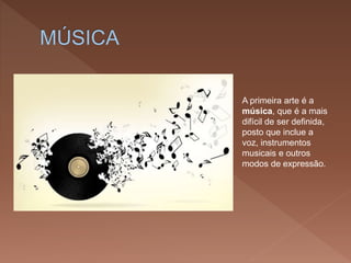 O documento lista e descreve as principais artes ao longo da história, começando pela música, dança e pintura. Em seguida, fala sobre escultura e arquitetura, teatro, literatura e cinema como as sete artes originais. Por fim, menciona outros meios artísticos como fotografia, videogames, quadrinhos e arte digital.