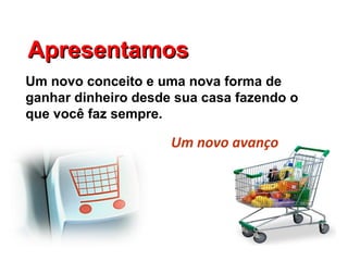 Este documento apresenta uma proposta de negócio de venda multinível de produtos de supermercado. A proposta é legal segundo a lei de 200 países e permite ganhar comissões sobre as vendas de novos distribuidores recrutados. O documento explica como se tornar distribuidor pagando uma taxa anual de R$75 e começar a ganhar comissões recrutando outros distribuidores.