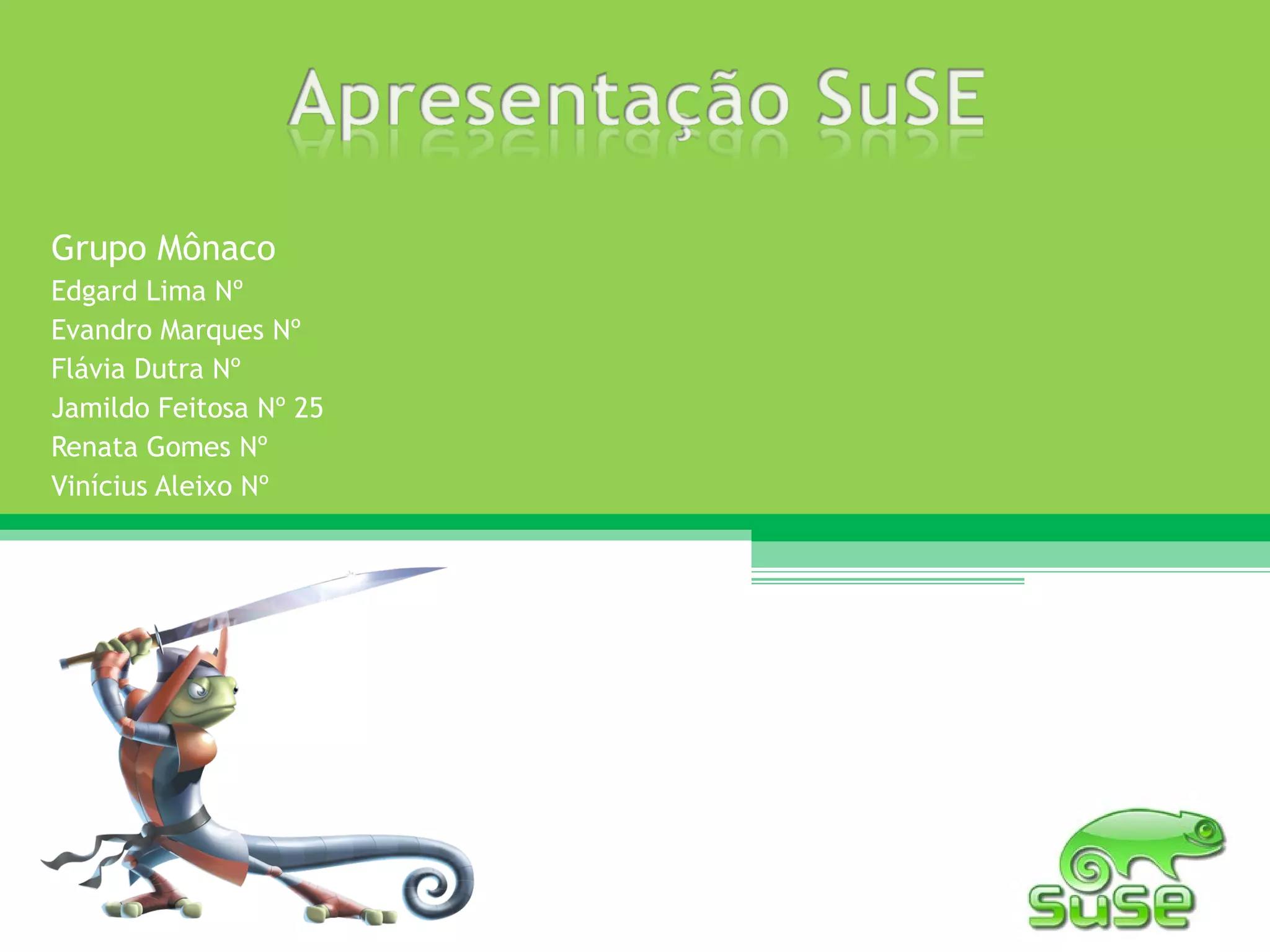 O documento descreve a história e as características da distribuição SUSE Linux. SUSE Linux foi fundada na Alemanha em 1992 e lançou sua primeira distribuição em 1993, baseada em outras distribuições iniciais como SLS e Slackware. Atualmente a SUSE Linux é propriedade da Novell e oferece soluções comerciais e a comunidade OpenSUSE.
