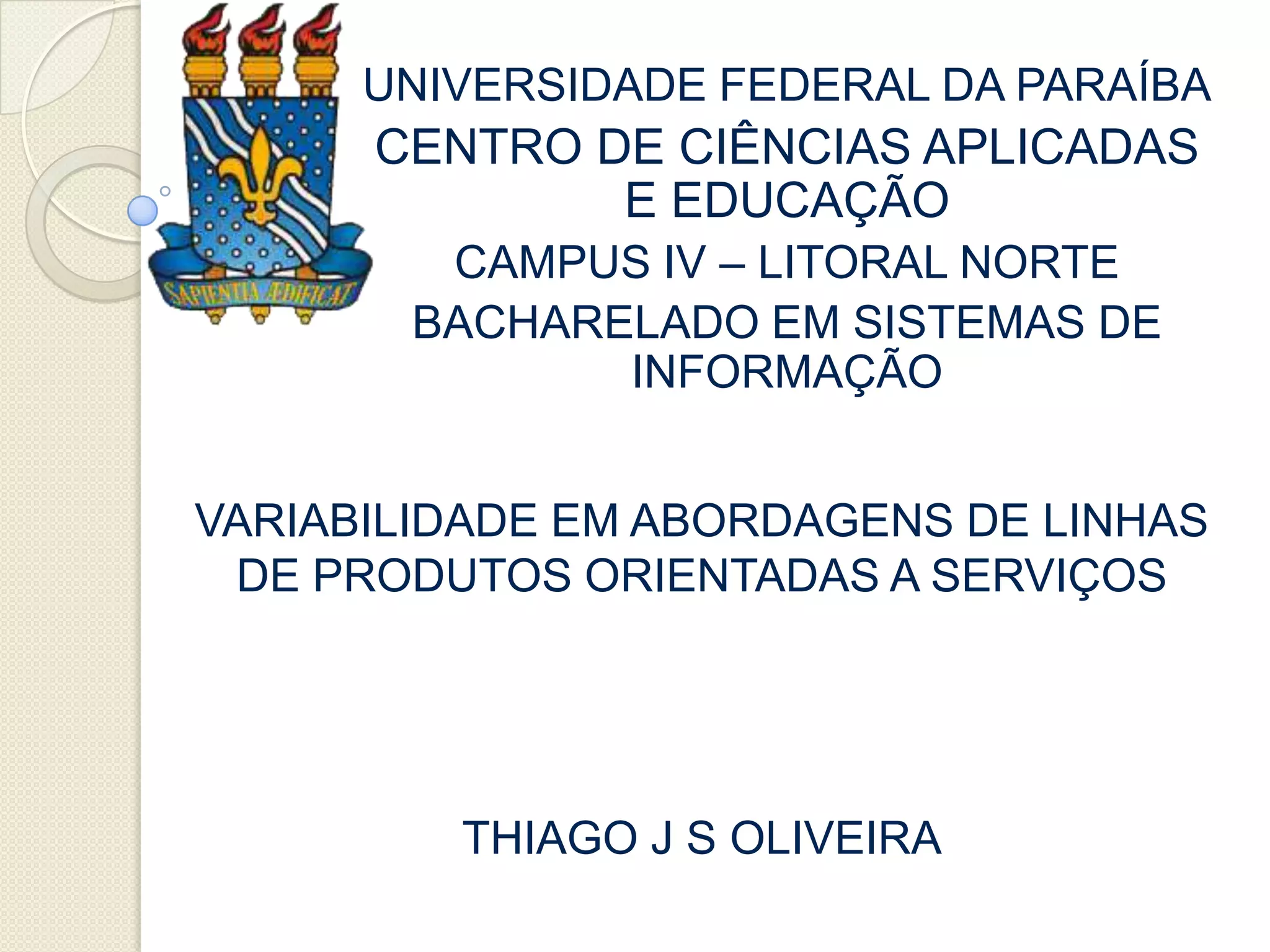 Este documento apresenta uma pesquisa sobre variabilidade em abordagens de linhas de produtos orientadas a serviços. Aborda representações de variabilidade, tipos de variabilidade em SOPL e como algumas abordagens lidam com variabilidade na derivação de produtos.