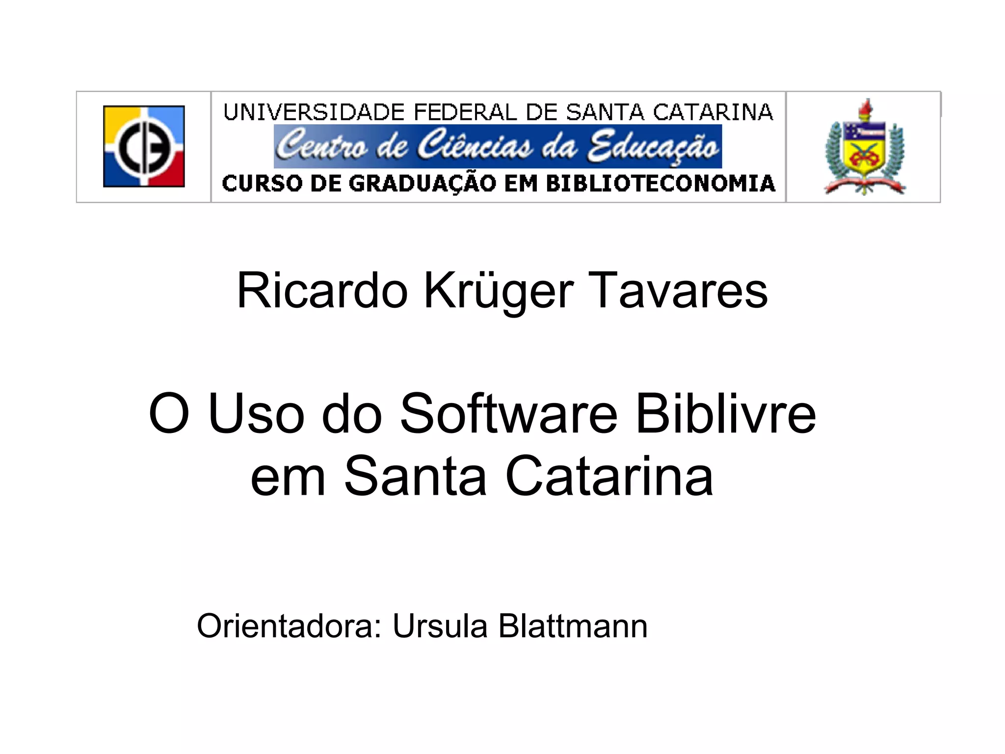 O documento analisa o uso do software livre Biblivre para informatização de bibliotecas em Santa Catarina, Brasil. Foi realizada uma pesquisa com usuários do Biblivre na região para identificar dificuldades de instalação e uso, além de caracterizar vantagens e limitações. A pesquisa concluiu que a falta de treinamento é um fator que leva muitos usuários a abandonar o software, apesar de sua gratuidade e funcionalidades básicas para bibliotecas.