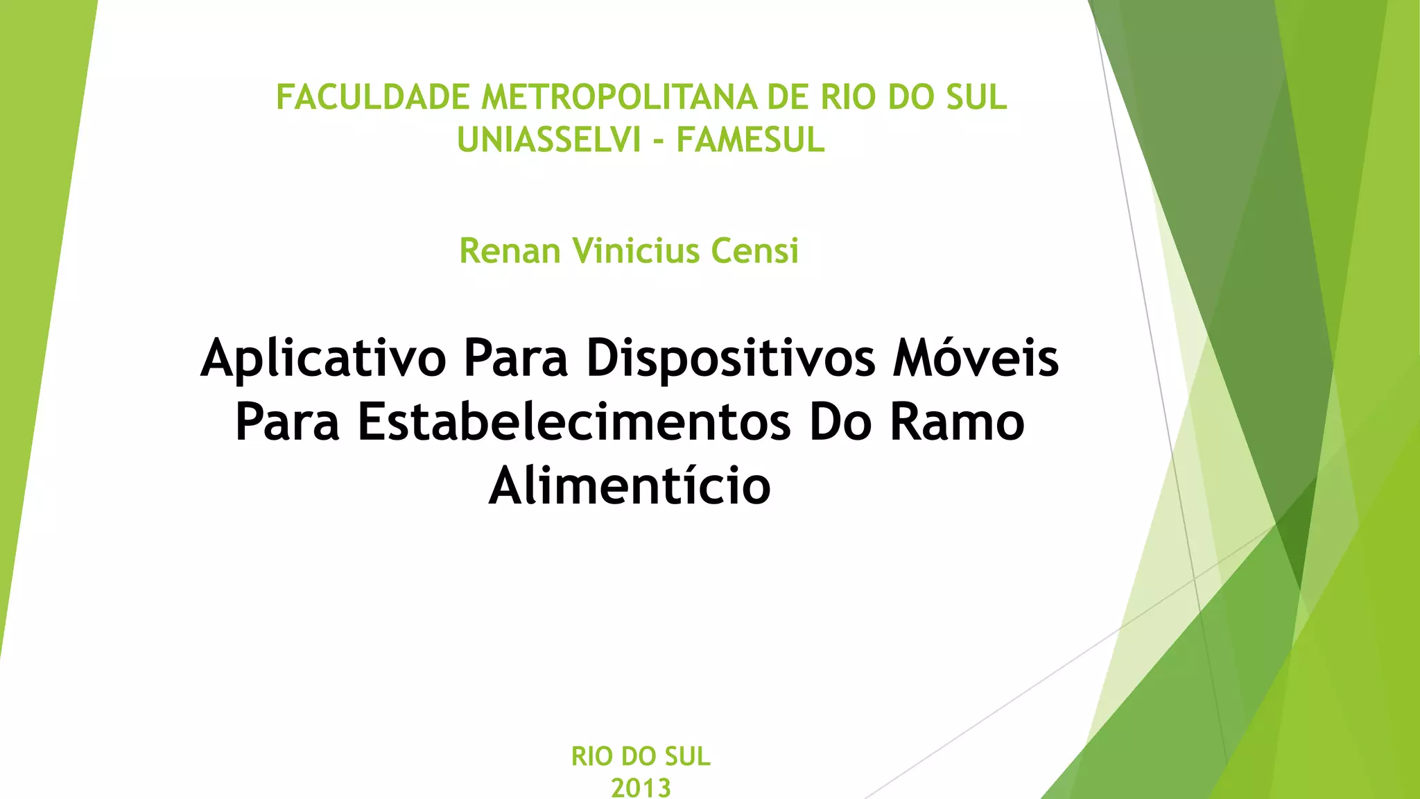Este documento descreve um aplicativo móvel para estabelecimentos alimentícios desenvolvido como trabalho de conclusão de curso. Uma pesquisa com estudantes mostrou que a maioria tem interesse no aplicativo e usa dispositivos Android. Uma pesquisa com gerentes revelou que eles têm interesse em usar o aplicativo para pedidos e reservas.