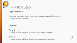 Este documento resume um projeto de reposicionamento de marca para a Academia Qualivida. Ele inclui: 1) Uma pesquisa para confirmar se a comunicação é um problema e analisar a percepção dos clientes; 2) Um planejamento estratégico de marketing integrado com objetivos de aumentar a participação de mercado e a carteira de alunos; 3) Uma proposta de nova identidade visual e campanha de marketing de guerrilha, mídia, eventos e digital para reposicionar a marca.