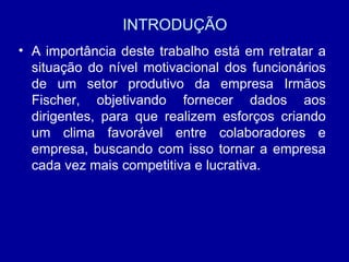 Este estudo de caso analisa os fatores motivacionais de funcionários de uma empresa de concreto na região do Vale do Itajaí. Por meio de entrevistas e questionários, o estudo identificou os cinco fatores mais importantes para os funcionários como salário, reconhecimento, ambiente de trabalho, plano de saúde e treinamentos. Embora esses fatores sejam altamente importantes, apenas alguns como plano de saúde e benefícios de transporte tiveram alto desempenho segundo os funcionários. O estudo fornece recomendações